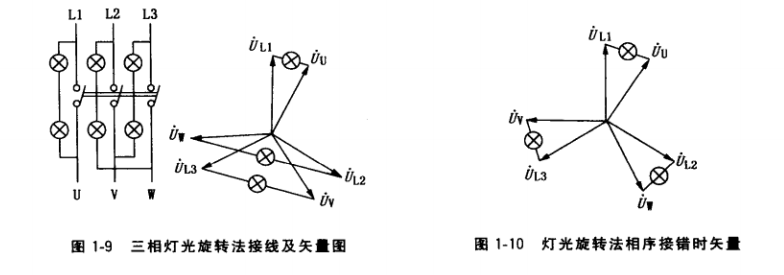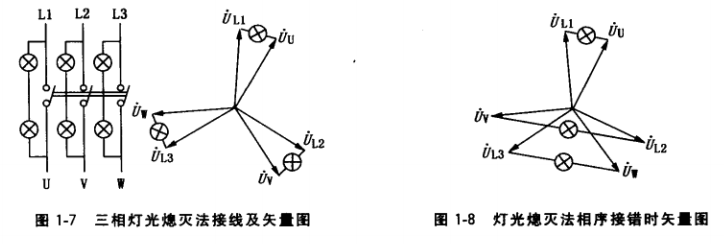 ①三相灯光熄灾法。图1-7是相灯光熄灭法并机接线及矢量图。对于400V系统,每相用两个220V灯泡串联后,跨接在对应相开关两端(对于220V系统.只要用一只220V灯泡即可)。当相序一致时,待并发电机和系统电压矢量间的关系如图1-7所示。图中U1.1、U1.2和U1.3为系统三相电压矢量,UU、UV、Uw为待并发电机三相电压矢量。若系统电压向量是静止的,则发电机电压向量以两者的角速度差绕其旋转。由于三相的角速度差是相等的,加在2只串联灯泡的电压都在0至2倍相电压之间变化,因此,三相灯光呈同明同暗变化。当开关两侧对应相相间电压接近零时,说明发电机已满足同期条件,此时合闸即可将发 电机并入系统。若发电机相序接错,其矢量图如图1-8所示,则三相灯光不是呈同明同暗变化,而是旋转发光,此时不能将发电机并入系统。
